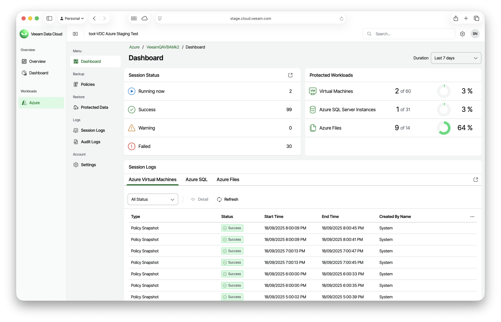 The Veeam Data Cloud for Microsoft 365 dashboard shows the status of your backup sessions and the associated Microsoft Azure workloads being protected, as well as session logs. On the left-hand column, you can get quick access to your current backups, backup policies, and the resources available to you.