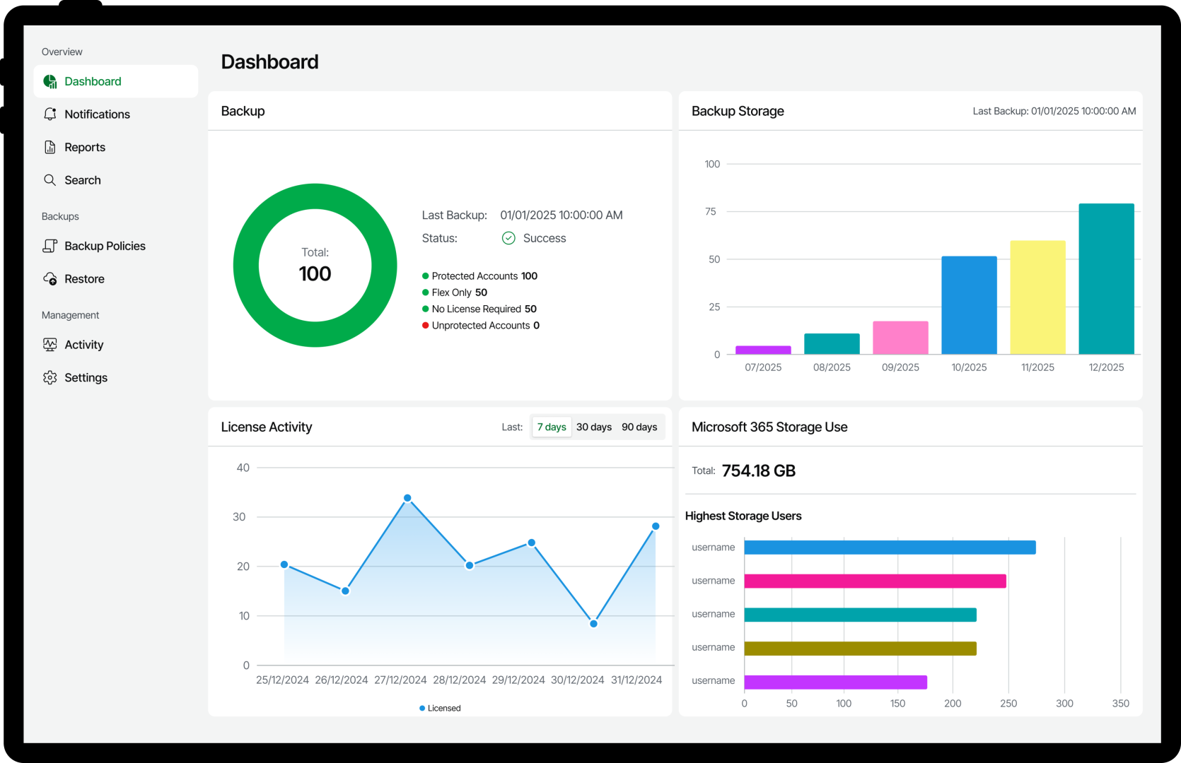 This backup service provides comprehensive data protection and data recovery for Microsoft Exchange, SharePoint, OneDrive for Business, and Teams, giving you complete control of your Microsoft 365 environment.