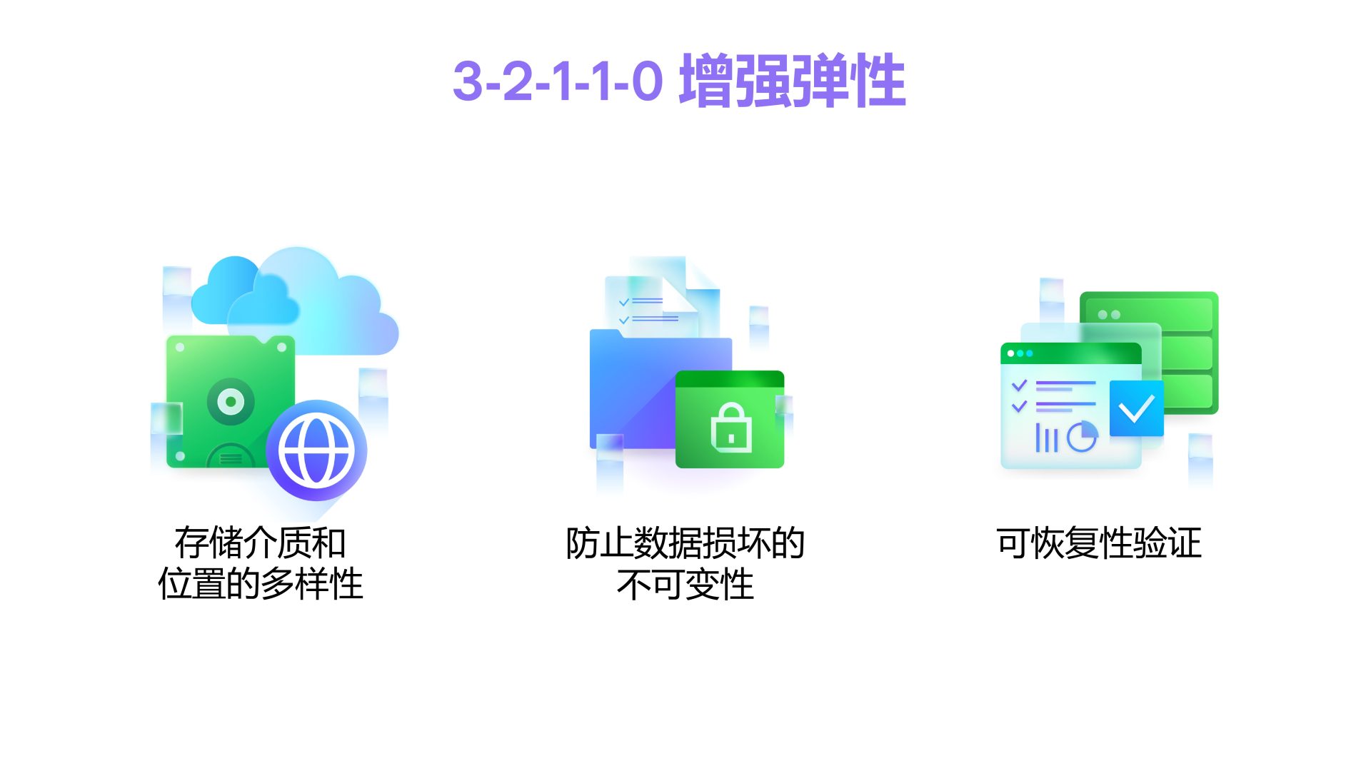 Veeam 的不同之处在于将该规则扩展,增加了一个 1 和 0,从而引入了不可变性和经过验证的可恢复性,帮助确保在各种事件中都能实现恢复。这种增强的规则通过更进一步的措施,提升了灵活性和安心感。