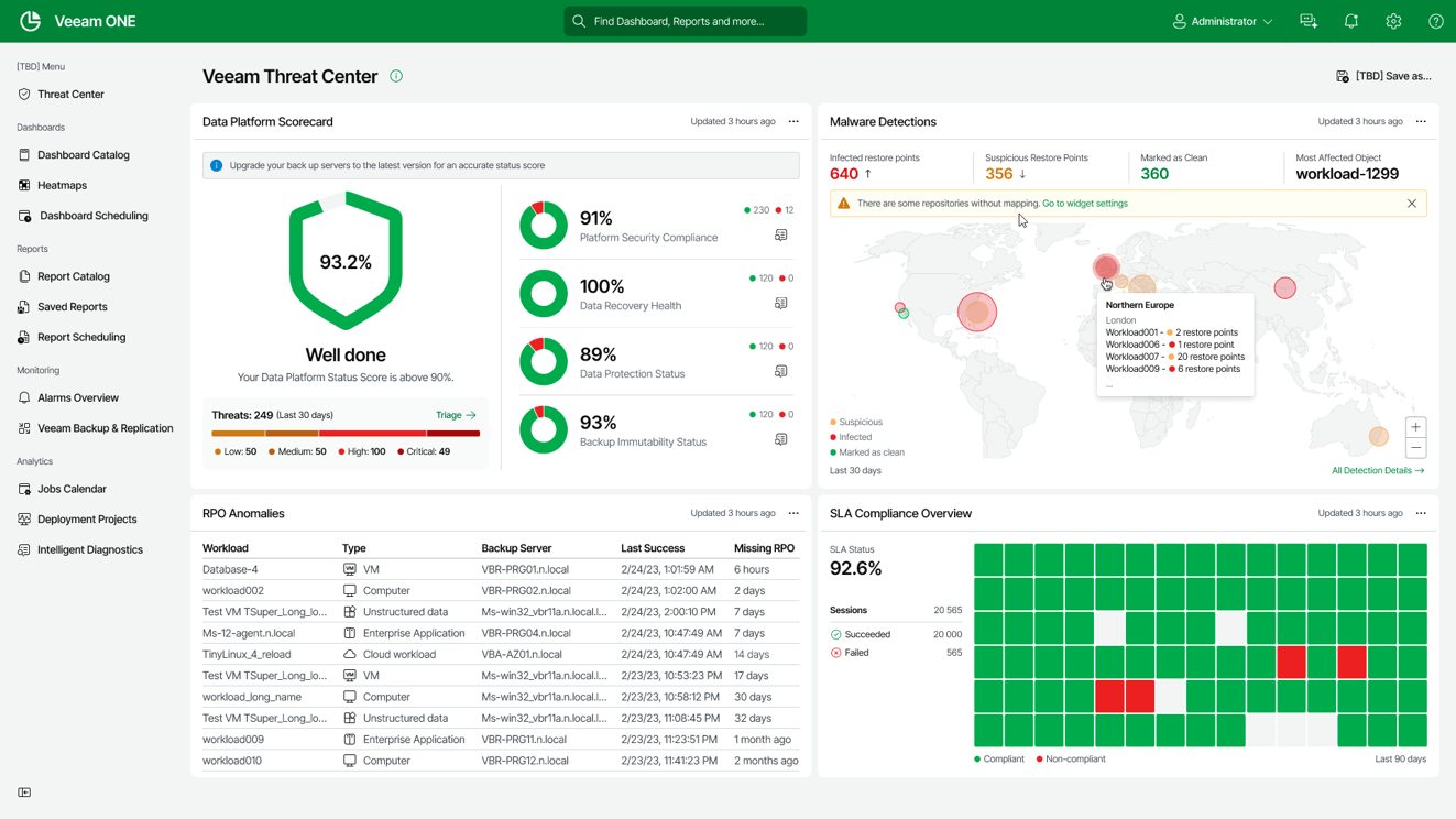 Veeam ONE, a key component of Veeam Data Platform, provides different dashboards that provide at-a-glance views of your environment. These analytics have been integrated throughout the platform, meaning you have access to curated dashboards, reports and all compliance-related activities all in one unified interface.