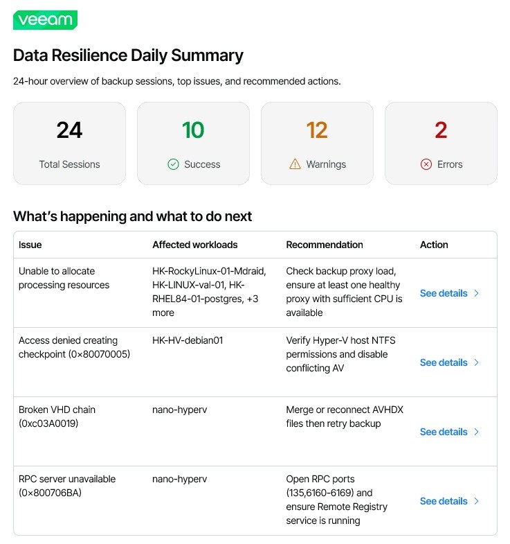Veeam Intelligence provides you with immediate insights on what is happening in your environment. Through its evolution, it has become increasingly useful, allowing you to ask it questions and run reports directly in the chatbot window. This can save so much time, as you don’t have to manually search through all the reports, it can supply the correct report to you instantaneously. To add to this, the Data Resilience Summary Report, powered by Veeam Intelligence, will aggregate job outcomes, group errors by workload for instant triage, and add context-aware recommendations with links to trusted KBs and guides. This will help you avoid compliance and security pitfalls, as you will be able to be proactive in fixing issues based on recommendations.