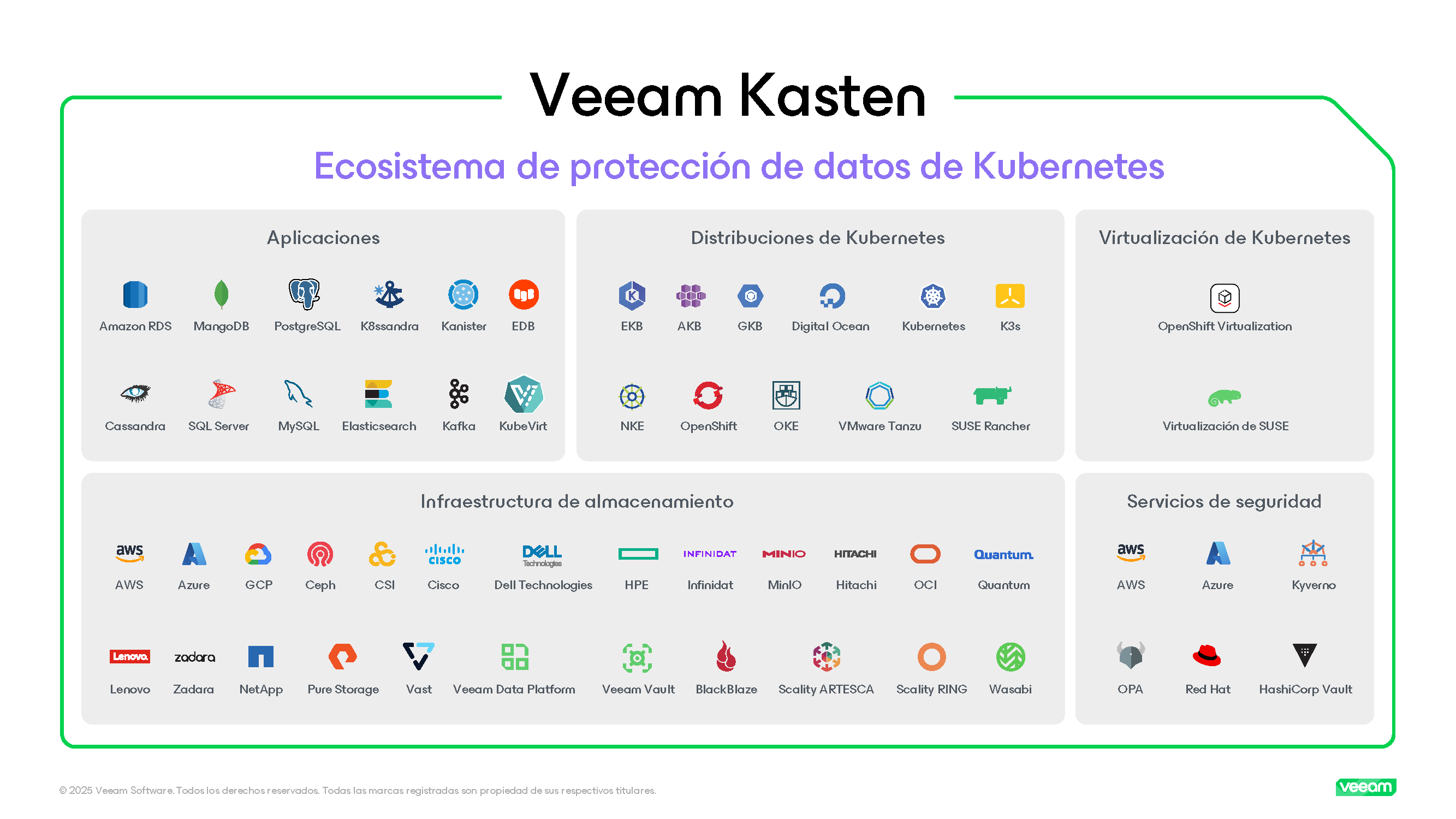 Veeam Kasten es el único Líder y “Outperformer” en el mercado de protección de datos de Kubernetes por quinto año consecutivo, según el informe GigaOm Radar. Nuestra solución es elegida por bancos, minoristas, agencias federales y organizaciones del sector público, entre muchos otros, para proteger tanto contenedores como VMs KubeVirt. Estas implementaciones reflejan los sólidos fundamentos de Veeam Kasten en seguridad, escalabilidad y libertad de datos, todo ello integrado de forma nativa para Kubernetes y reforzado mediante profundas integraciones técnicas con socios como Red Hat, Microsoft, AWS y SUSE.