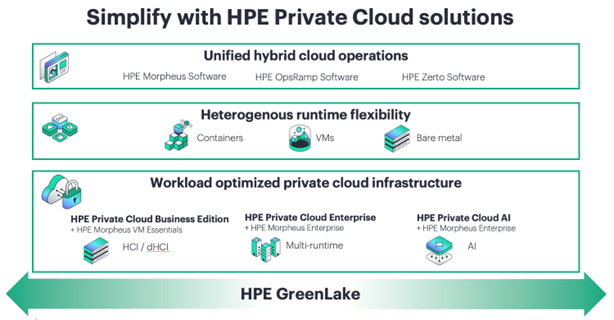 - HPE Private Cloud Business Edition : Engineered systems based on HPE SimpliVity or dHCI with integrated management.