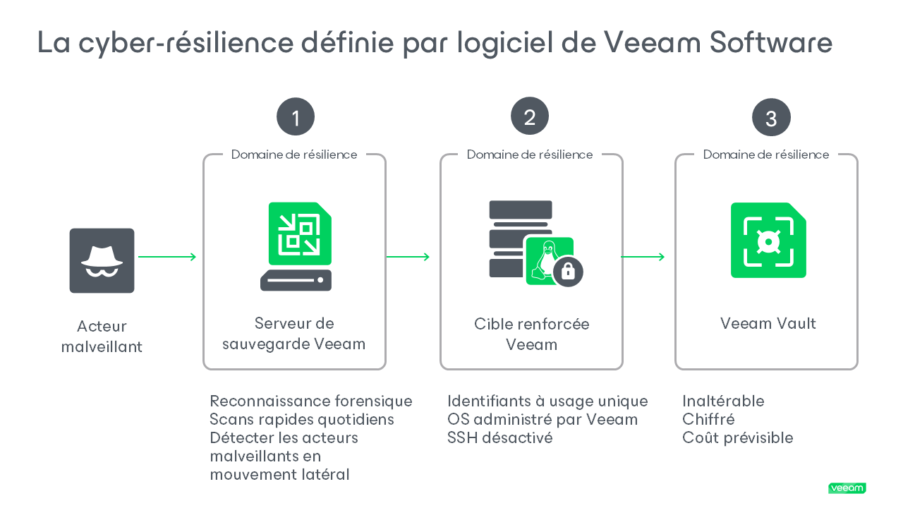 - Veeam propose plusieurs options d’inaltérabilité : que vous utilisiez des cibles Linux renforcées, du stockage objet avec verrouillage d’objets S3, du stockage sur bande/WORM ou Veeam Data Cloud Vault, Veeam garantit l’inaltérabilité de façon native sur l’ensemble de ces architectures.