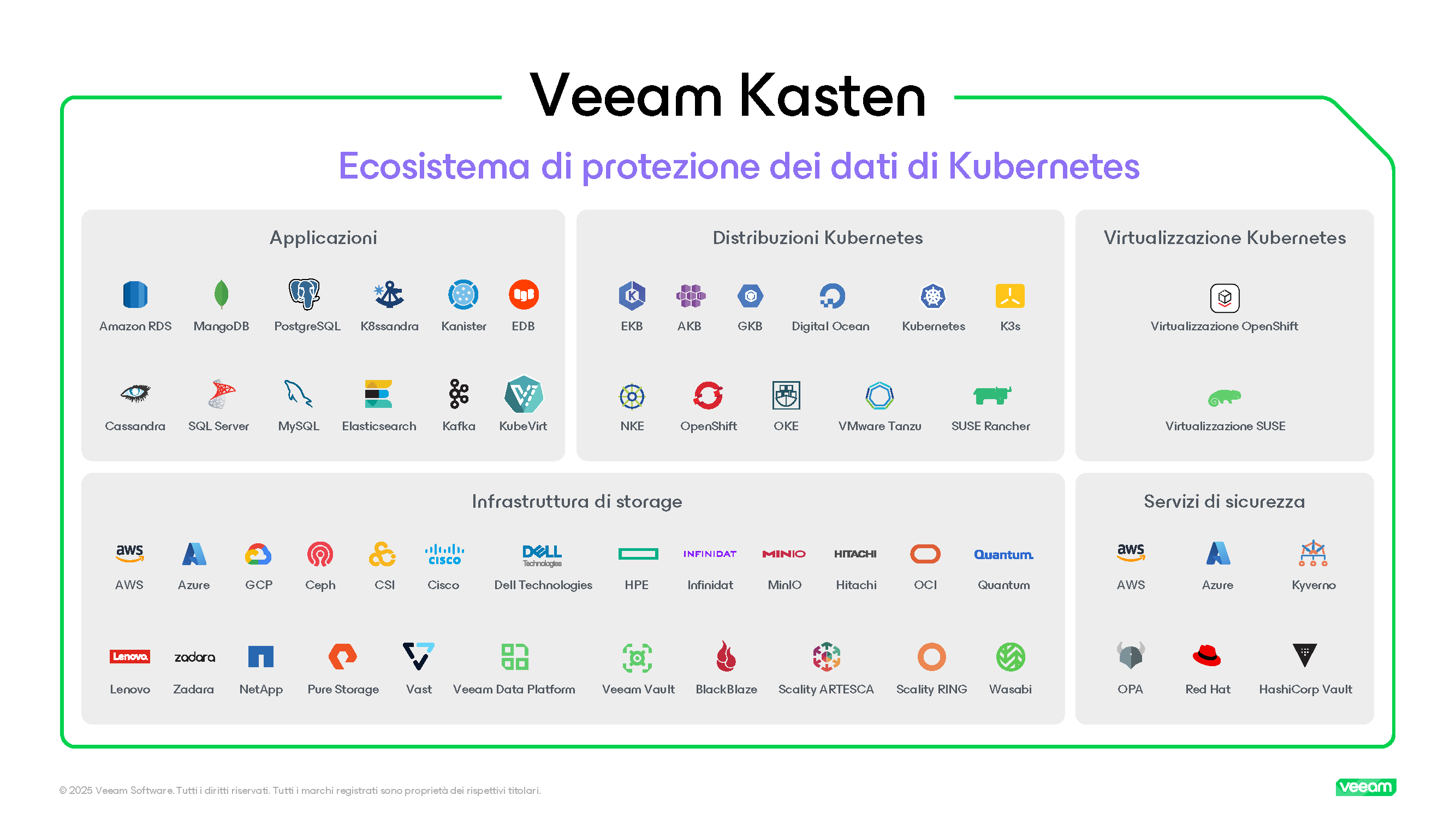 Veeam Kasten è l’unico Leader e top performer nel mercato della protezione dei dati in ambiente Kubernetes per il quinto anno consecutivo, come riportato da GigaOm Radar. La nostra soluzione è scelta da banche, rivenditori, agenzie federali e organizzazioni del settore pubblico, tra molti altri, che si affidano a noi per proteggere sia i contenitori che le VM KubeVirt. Queste implementazioni riflettono le solide basi di Veeam Kasten in termini di sicurezza, scalabilità e libertà dei dati, tutte realizzate in modo nativo per Kubernetes e rinforzate da profonde integrazioni tecniche con partner come Red Hat, Microsoft, AWS e SUSE.