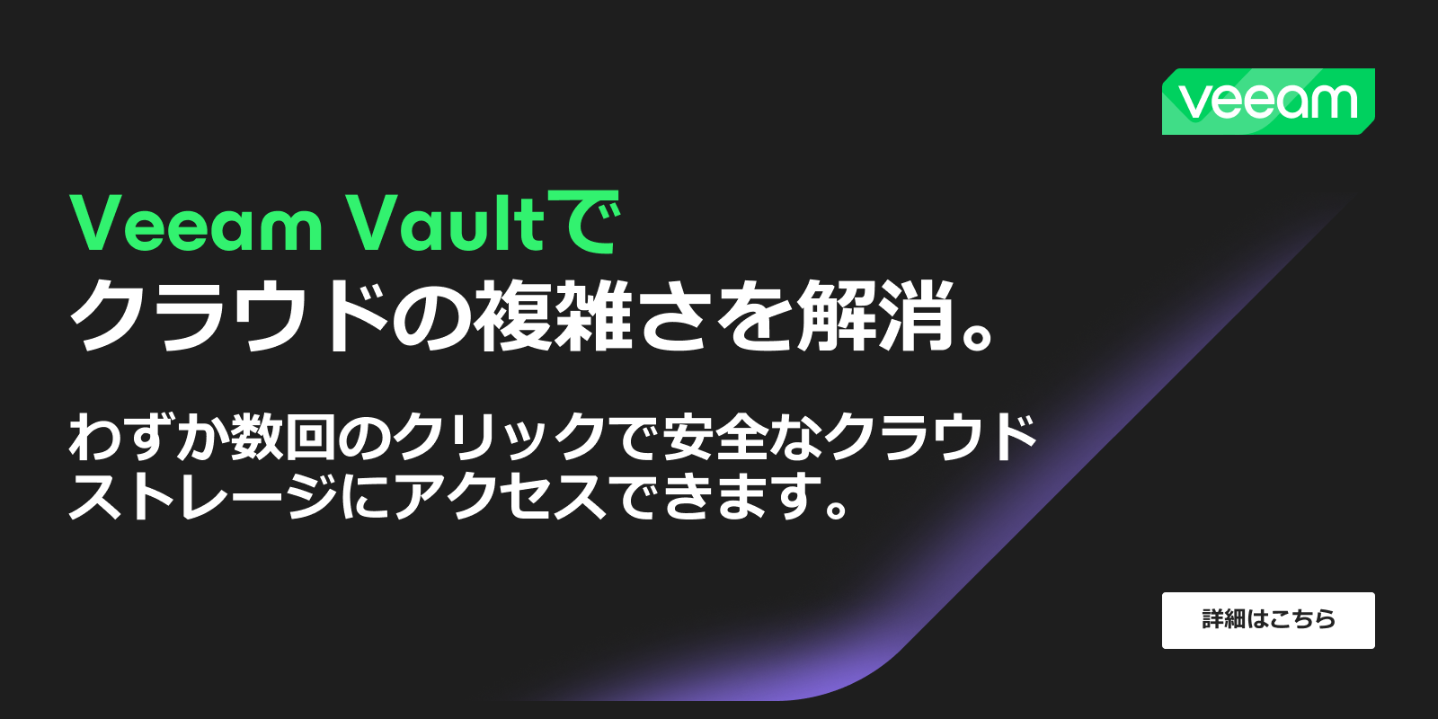 Veeam(ヴィーム)は、Veeam Data Platform(ヴィーム・データ・プラットフォーム)やVeeam Kasten(ヴィーム・カステン)とVeeam Vault(ヴィーム・ボールト)を組み合わせて、企業のクラウドバックアップおよびストレージのニーズに応えるためのツールやソリューションを提供しています。今すぐお問い合わせいただき、無料相談をご予約ください。または、のホワイトペーパーをダウンロードして、Veeamが貴社のビジネス継続性をどのように支援できるかをご確認ください。