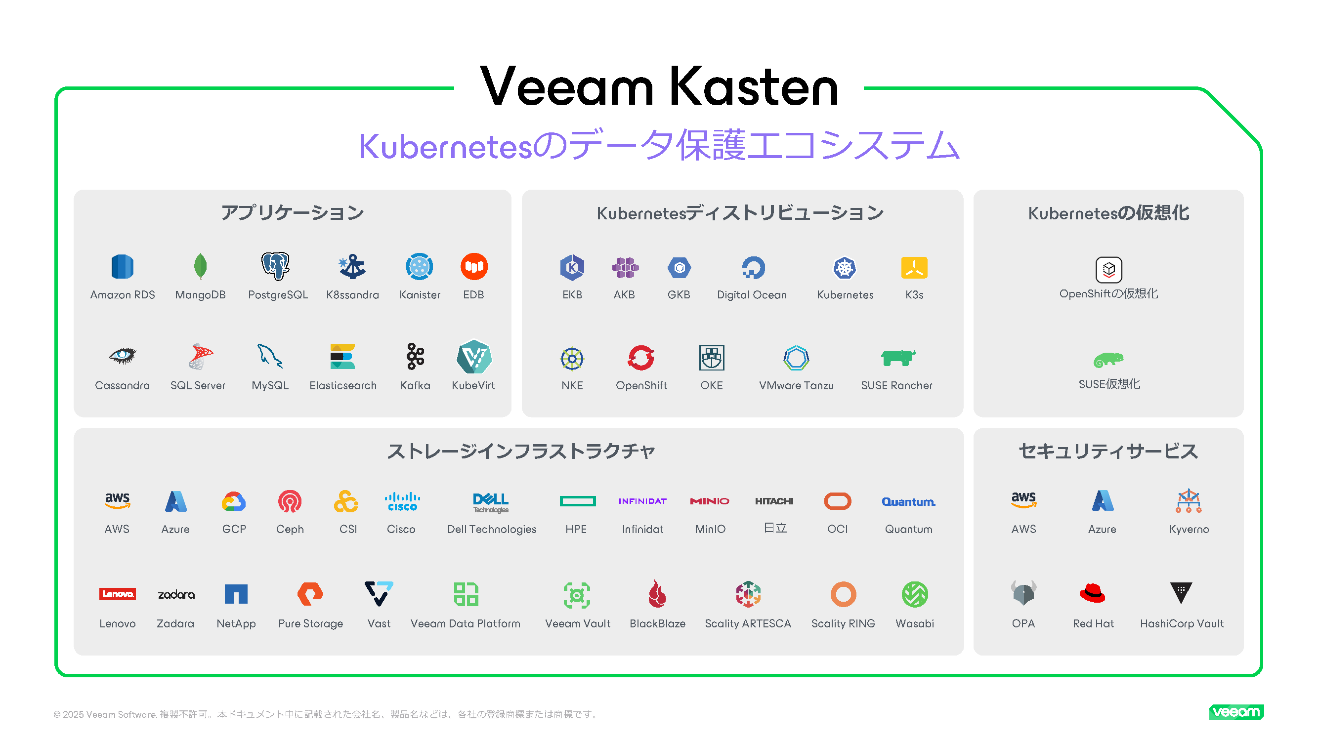 VMware(ヴイエムウェア)からの移行、仮想化のモダナイゼーション、AIパイプラインのセキュリティ強化、Kubernetes(クバネティス)バックアップ戦略の更新など、どのような状況でも、Veeam Kasten(ヴィーム・カステン)はお客様の現状に寄り添い、必要な場所へと導きます。