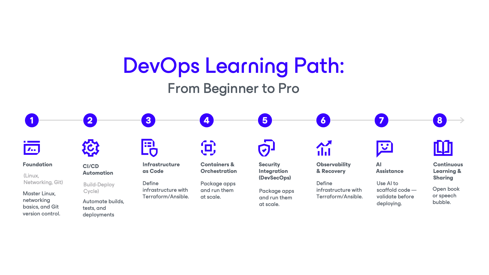 Pro Tip: Build your skills in layers; start with Linux, Git, and CI/CD, then add IaC, containers, and cloud knowledge. Keep security in mind from day one and remember: Hands‑on practice turns theory into skill.