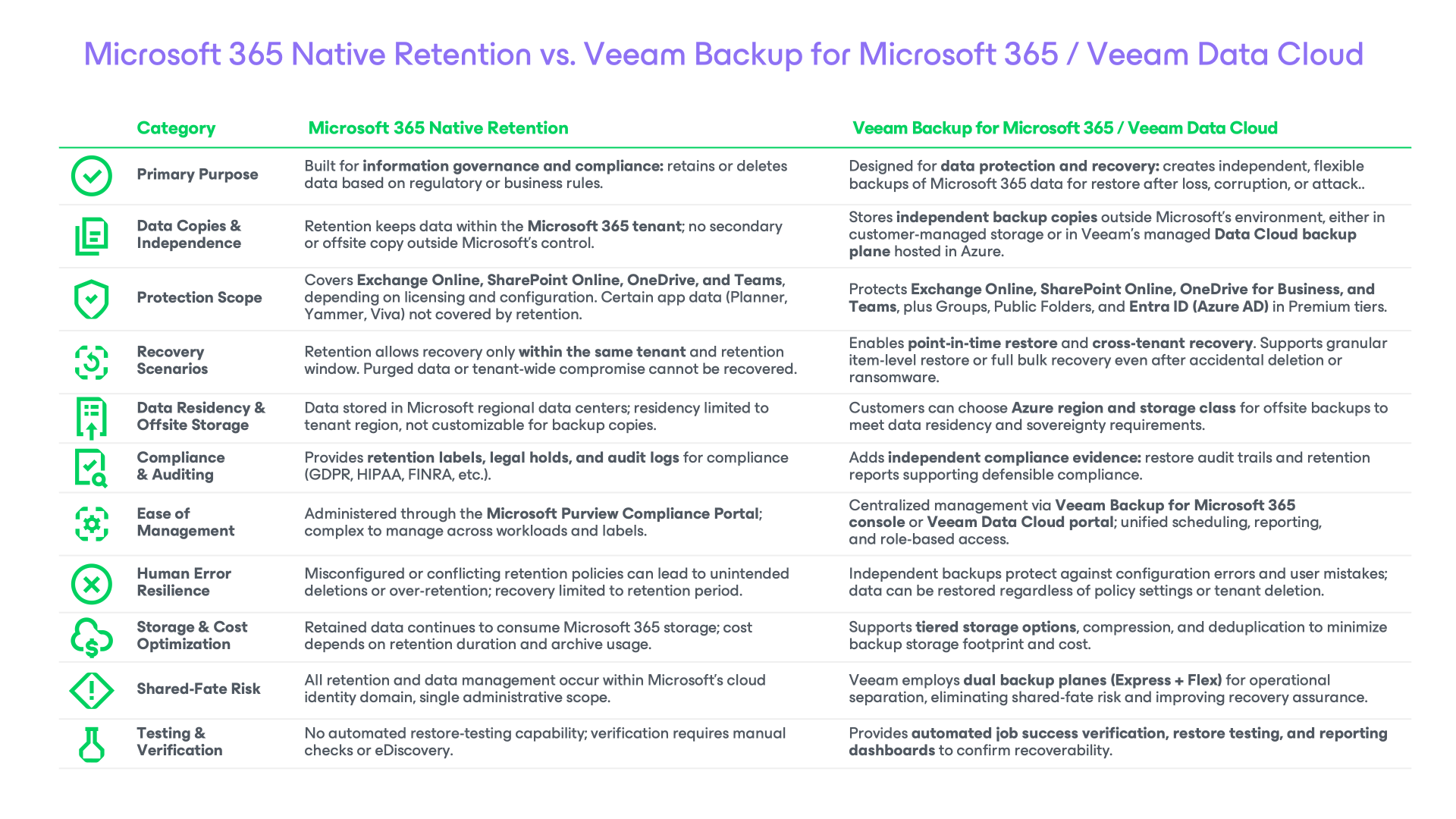 This is where Veeam Data Cloud for Microsoft 365 delivers complete peace of mind. By combining Microsoft 365’s built‑in governance features with Veeam’s secure and automated backup and recovery, you get: