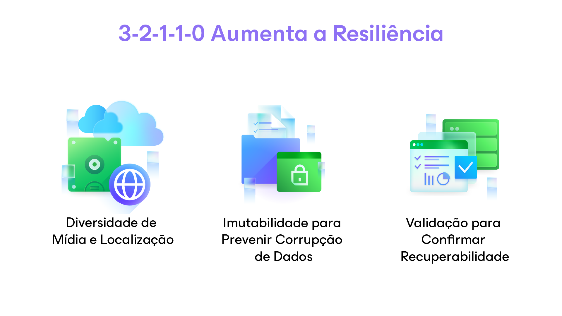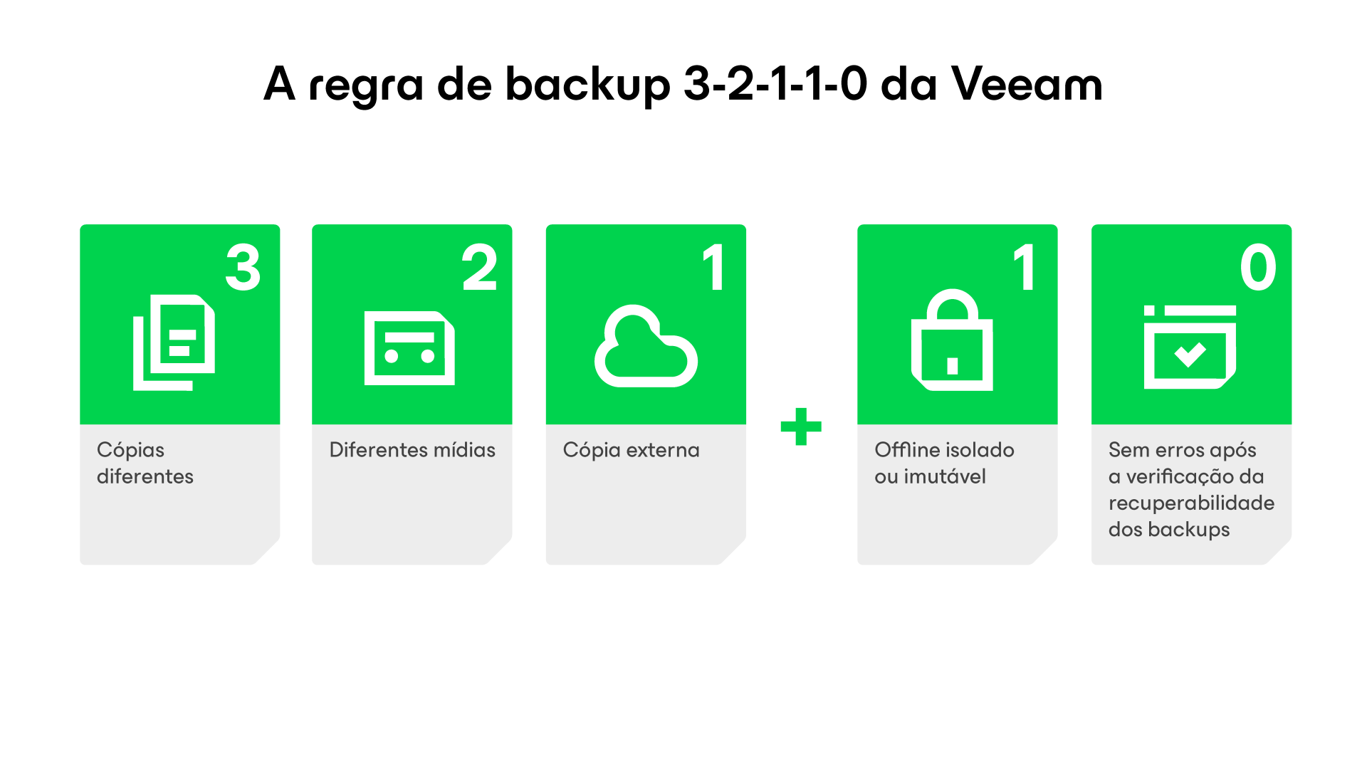 A Veeam estendeu a regra para 3-2-1-1-0. Isso adiciona uma cópia imutável e resulta em zero erros de recuperação. Essa abordagem aprimorada fornece uma base sólida para a proteção de dados moderna e a continuidade dos negócios, totalmente suportada pela Veeam Data Platform.