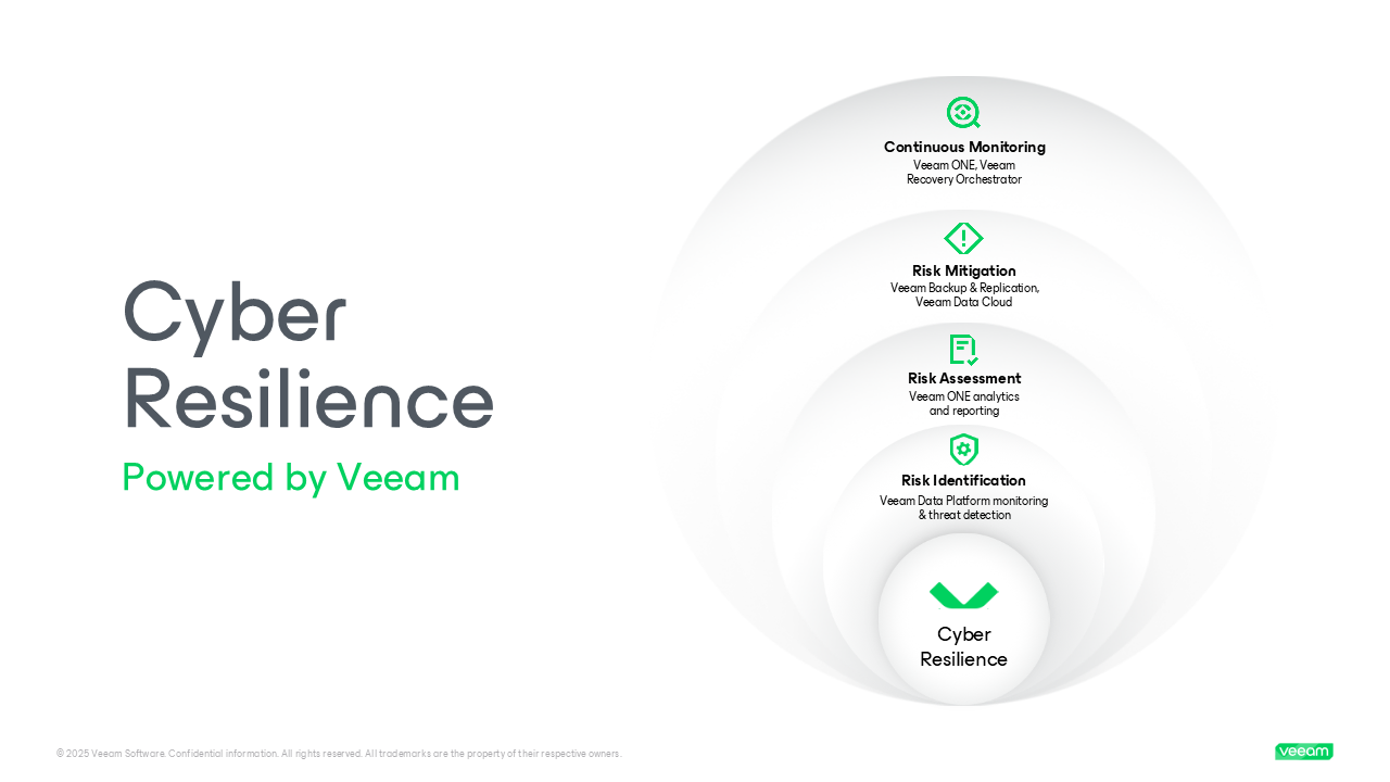 Being cyber resilient means you can recover quickly, completely, and securely when incidents inevitably occur. Veeam’s data resilience offerings are built on the principle that your backup and recovery environment must be as secure and resilient as your production systems.