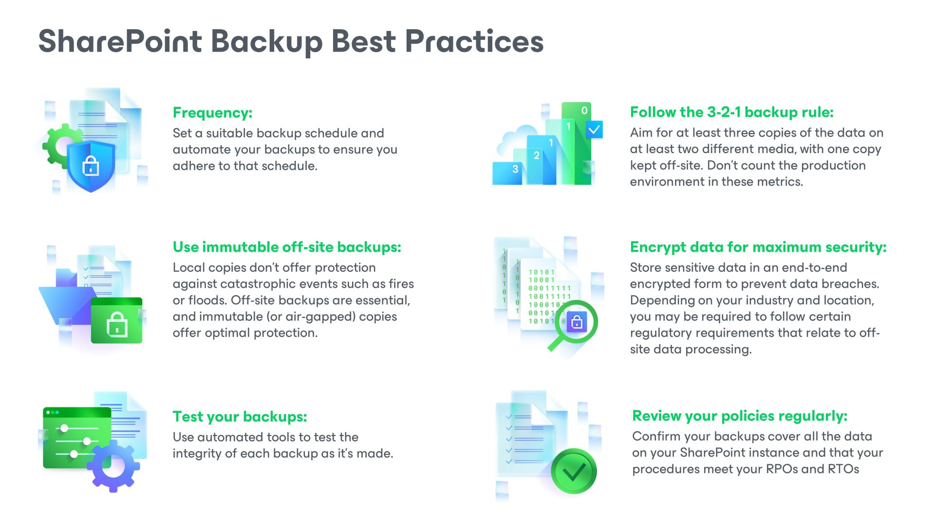 • Review your policies regularly: Confirm your backups cover all the data on your SharePoint instance and that your procedures meet your RPOs and RTOs.