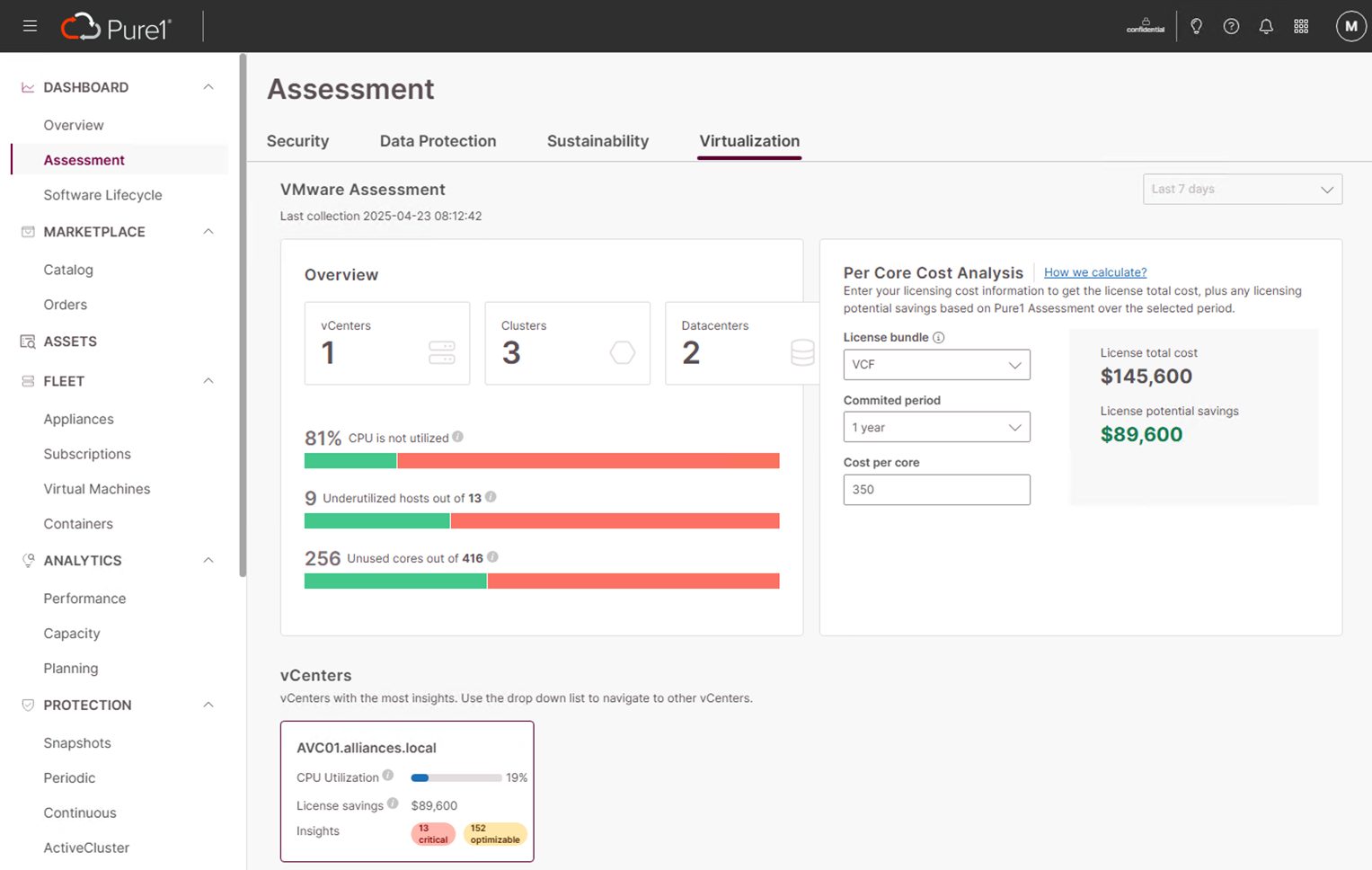 Begin with Pure1’s Virtualization Assessment to get an overview of your overall VMware estate. Pure1 offers a Per Core Cost Analysis calculator (Figure 1), providing a quick evaluation of VMware software costs and approximating potential license savings based on near real-time telemetry of host compute utilization and core count.