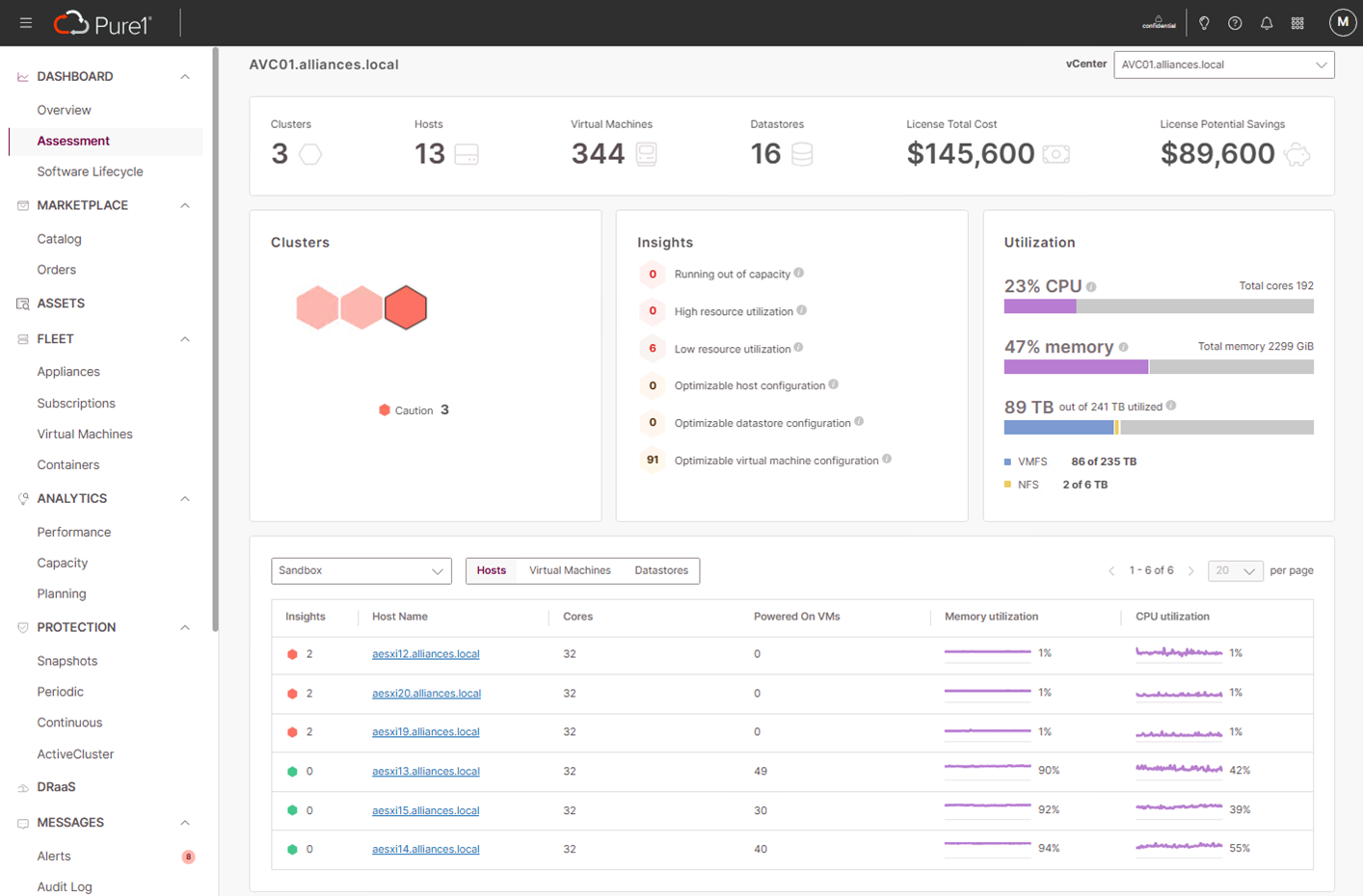 Pure1’s Virtualization Assessment enables you to pinpoint VMware hosts with potential resource imbalances. For example, Figure 2 highlights a host with 90% memory utilization but only 42% CPU utilization. Here, we’ll investigate whether any VMs are overprovisioned in terms of memory—optimizing this could enable you to add more VMs and balance resource utilization.