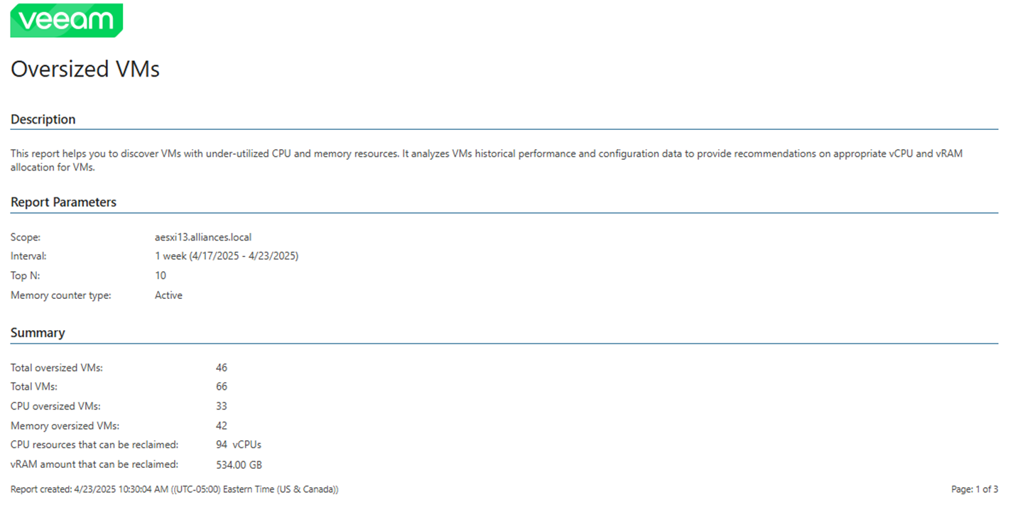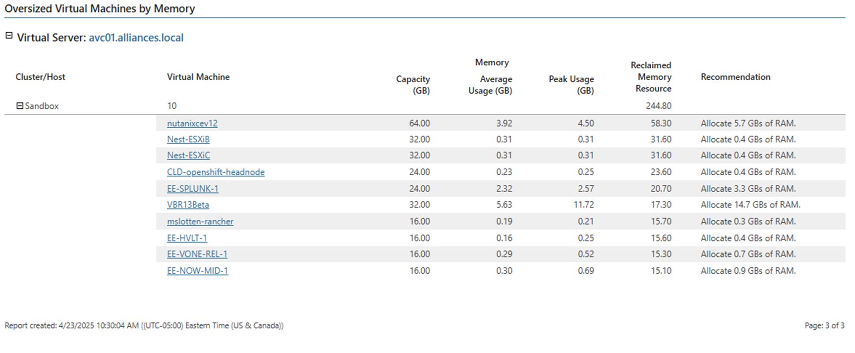 To determine if VM memory is being overprovisioned on this host, run Veeam ONE’s vSphere Optimization Reports—specifically, the Oversized VMs report. Scope the report to the target host and review the top 10 oversized VMs (Figure 3).