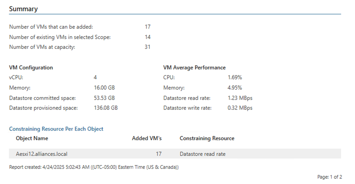 As seen in Figure 6, you can add up to 17 more VMs to this host without exceeding predefined CPU and memory utilization thresholds (e.g., 80% CPU, 90% memory).