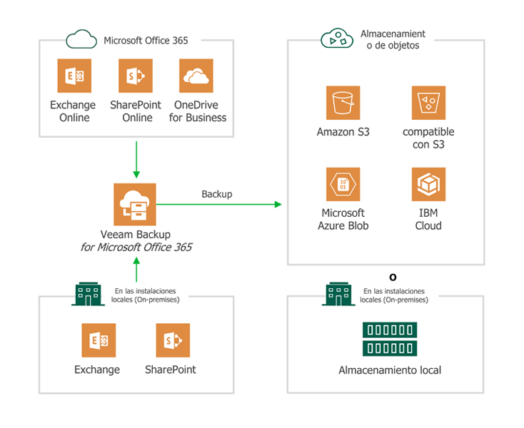 Algunos clientes eligen almacenar sus backups de Office 365 localmente, lo que resulta ideal si disponen de espacio de almacenamiento local extra, pero muchos clientes prefieren la nube pública, que es el destino ideal para los backups de Office 365 debido a su bajo coste, sencilla implementación y posibilidad de escalado ilimitado. Siempre que elija almacenar sus backups de Office 365, asegúrese de que dispone de las opciones que necesita