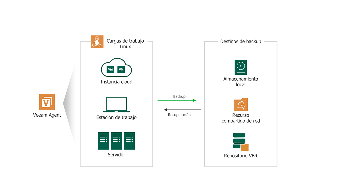 Con Veeam Agent® for Linux, puede garantizar con facilidad la disponibilidad de sus cargas de trabajo Linux, tanto si residen en la nube pública o en las instalaciones locales (on-premises).