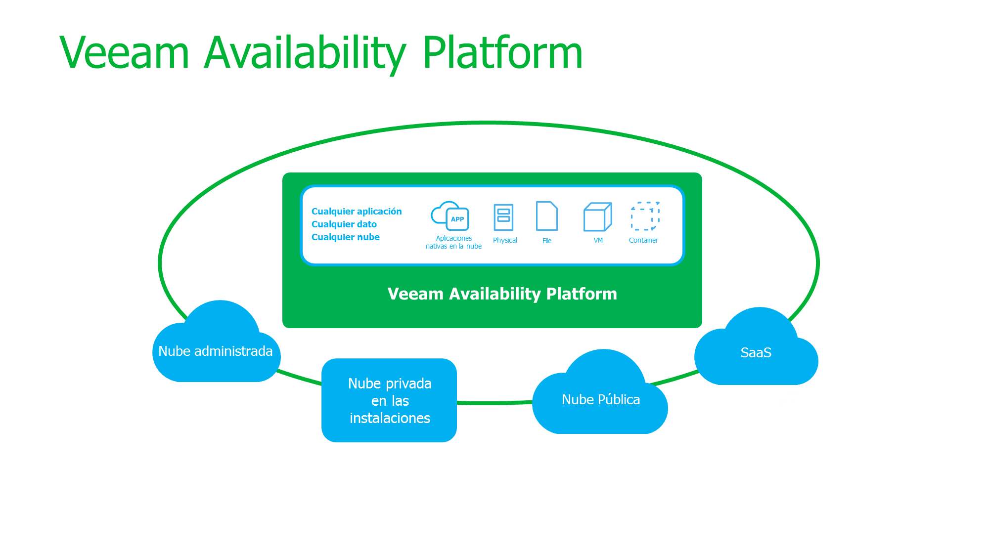 Organizaciones como la suya confían en Veeam para hacer realidad su transformación digital. Veeam Availability Platform para la nube híbrida ofrece la siguiente generación de Availability para Always-On Enterprise™, y proporciona a los negocios y empresas de cualquier tamaño los medios para garantizar la disponibilidad de las aplicaciones y datos en cualquier infraestructura cloud a través de las siguientes funcionalidades: