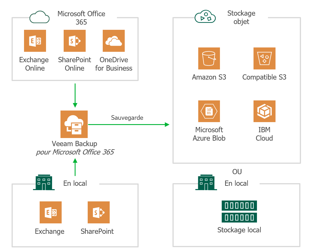 Pour vos données Office 365, Veeam ne vous restreint pas à une cible de stockage spécifique. Libre à vous de les stocker sur site ou dans un stockage objet dans le cloud (AWS S3, Azure Blob, IBM Cloud ou tout autre stockage compatible S3).