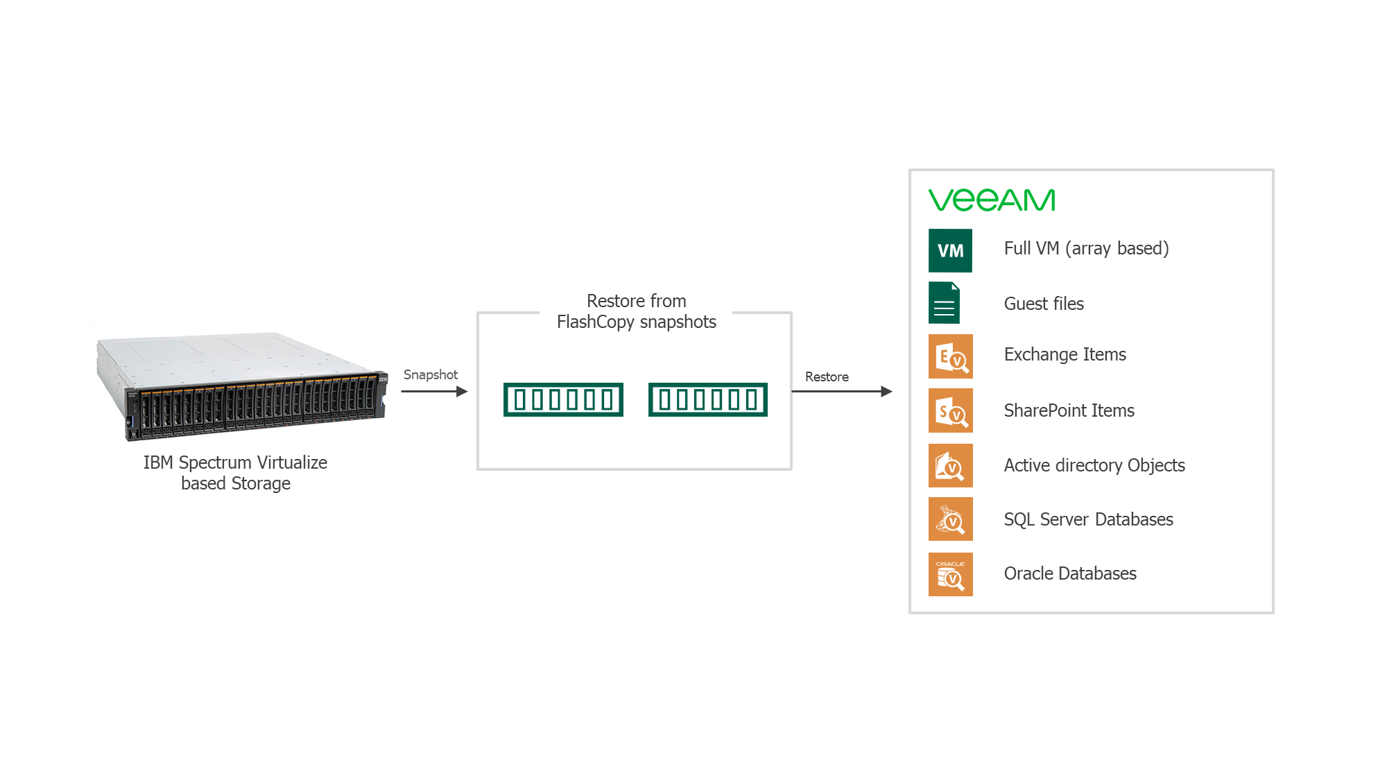 IBM Spectrum Virtualize — disponibile come opzione software o incluso nella famiglia IBM Storwize o in IBM SAN Volume Controller — è una soluzione integrata Veeam Ready testata e idonea al supporto agli storage snapshot di IBM FlashCopy per: