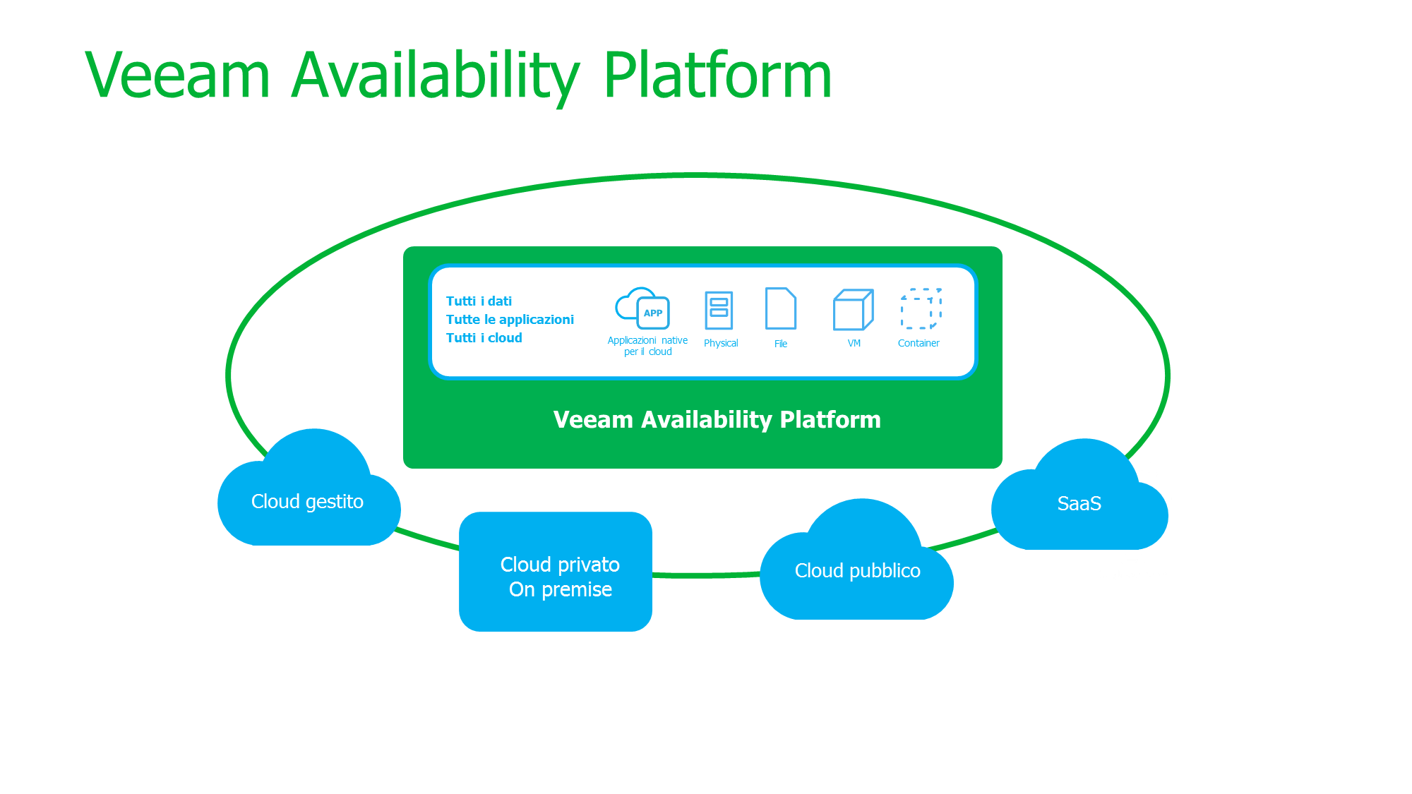 Le organizzazioni come la tua si affidano a Veeam per abilitare la propria trasformazione digitale. Veeam Availability Platform for the Hybrid Cloud offre la nuova generazione di Availability for the Always-On Enterprise™ e fornisce ad aziende di tutte le dimensioni i mezzi per garantire l’Availability di tutte le applicazioni e tutti i dati, attraverso qualsiasi infrastruttura cloud, grazie alle seguenti capacità: